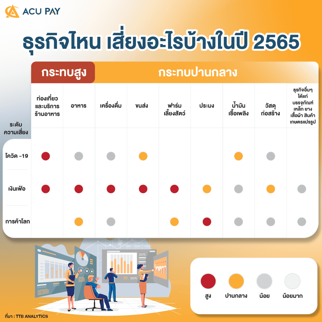 การดำเนินธุรกิจภายใต้สถานการณ์ที่เต็มไปด้วยความเสี่ยงรอบด้าน ผู้ประกอบการต้องพยายามประคับประคองรายได้ ของธุรกิจให้อยู่รอด ดังนั้น เพื่อเตรียมรับมือกับความเสี่ยงต่าง ๆ ที่จะกระทบกับธุรกิจ ttb analytics แบ่งผลการวิเคราะห์ความเสี่ยงต่าง ๆ ดังนี้